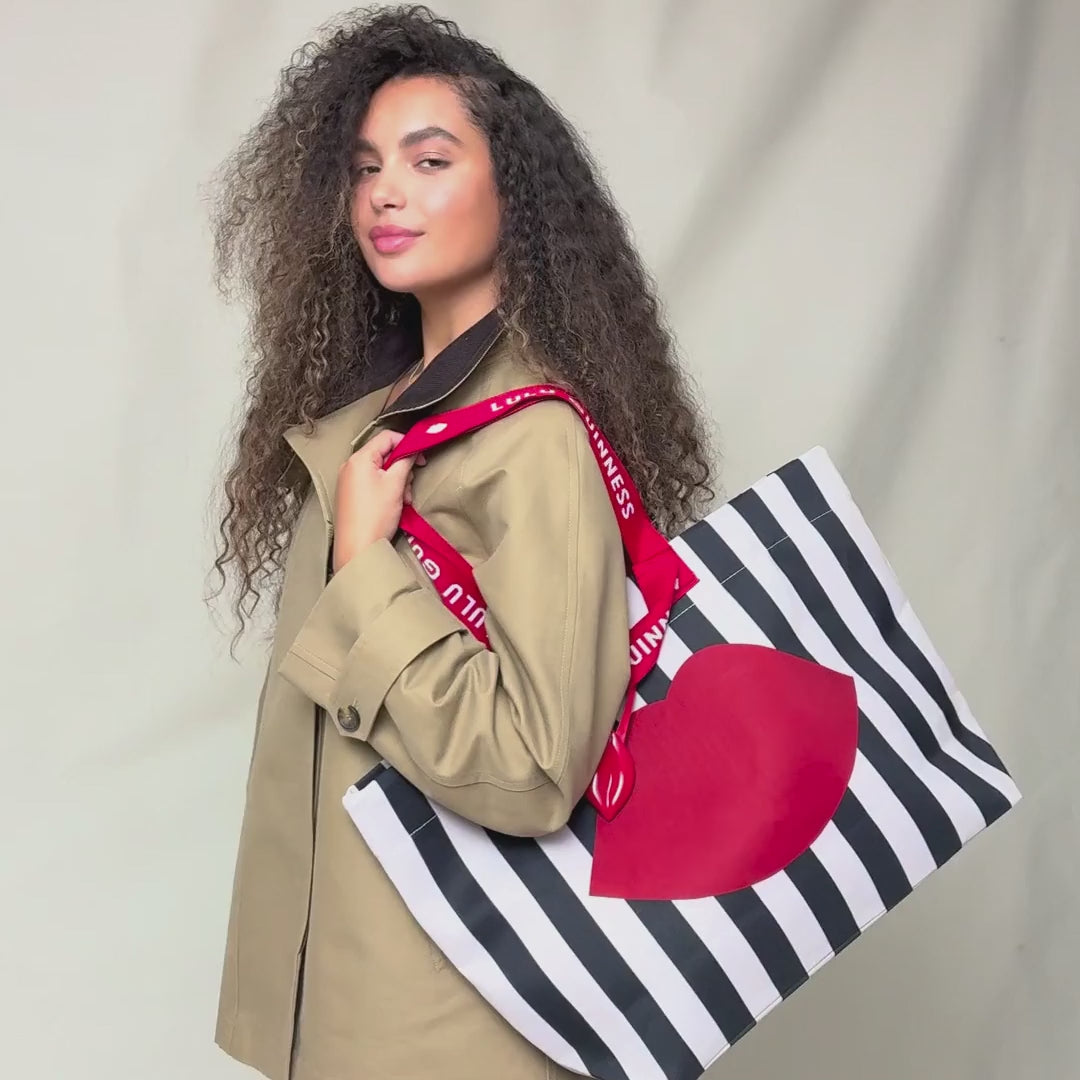 The UK's most famous Tote! Now's your chance to buy our coveted tote, with bold stripes, our signature lip motif and logo straps. Made from recycled plastic bottles, it's the carry-everywhere style.