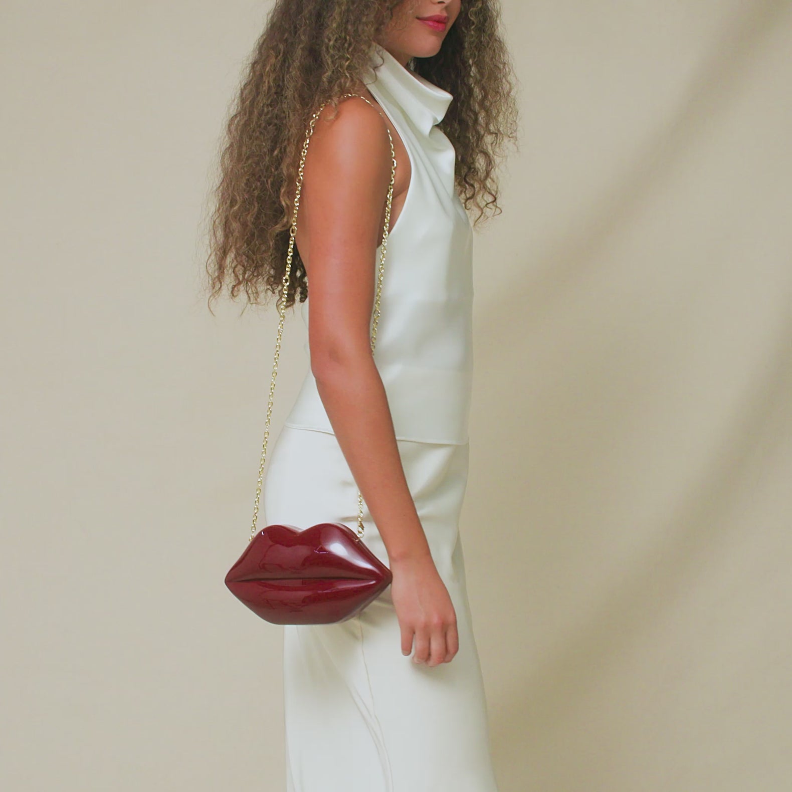 All hail the iconic Lips Clutch in our sultry new season Garnet Red shade. Crafted from hard shell acrylic, this statement piece can be carried as a clutch or crossbody using the lip link chain shoulder strap.