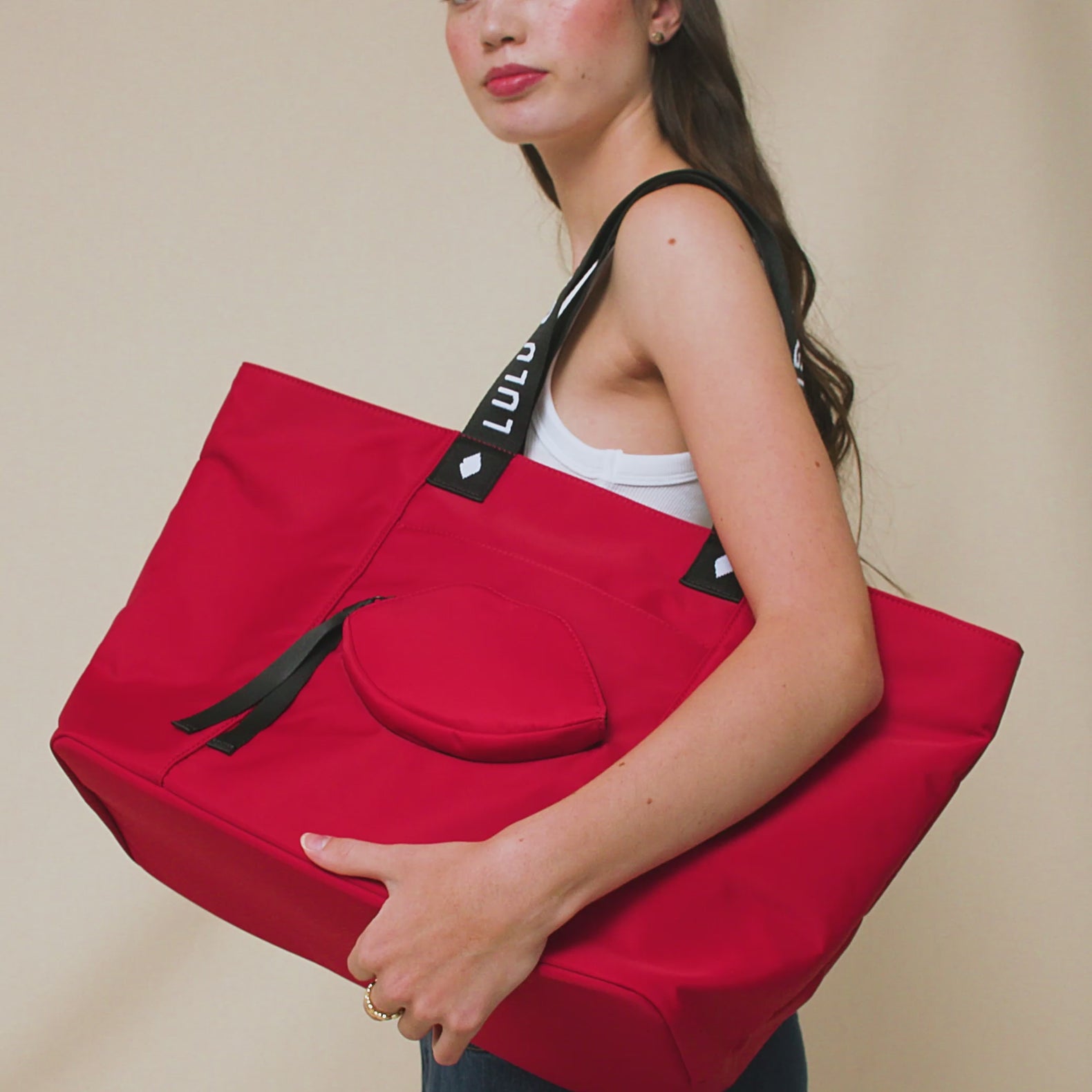 With clean lines and a roomy size, the Lulu Red Macy Tote is your essential carry-all. You'll love the handy lip-shaped outer zip pocket with ribbon detailing and the sporty logo straps. Macy also has a handy pocket at the back which can be used to slot over your suitcase handle.