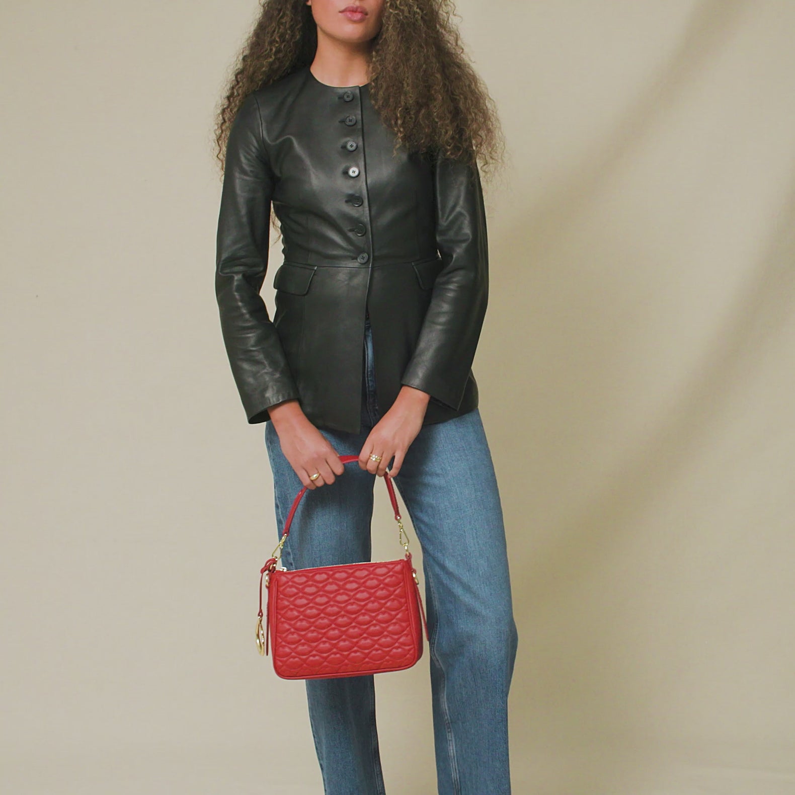 With signature lip-stamped design in luxury quilted leather, our small Callie in signature Lulu Red is your new shoulder bag to fall in love with. It’s all in the detailing, with a longer strap to carry cross body, shiny gold hardware and cute detachable lip charm for a playful finish.